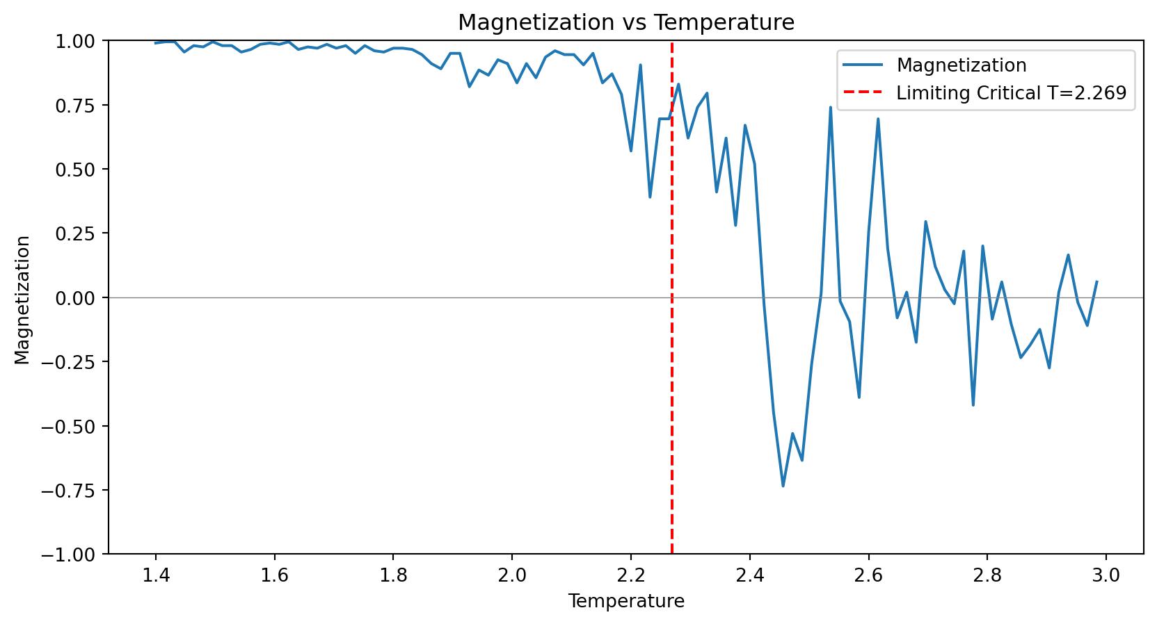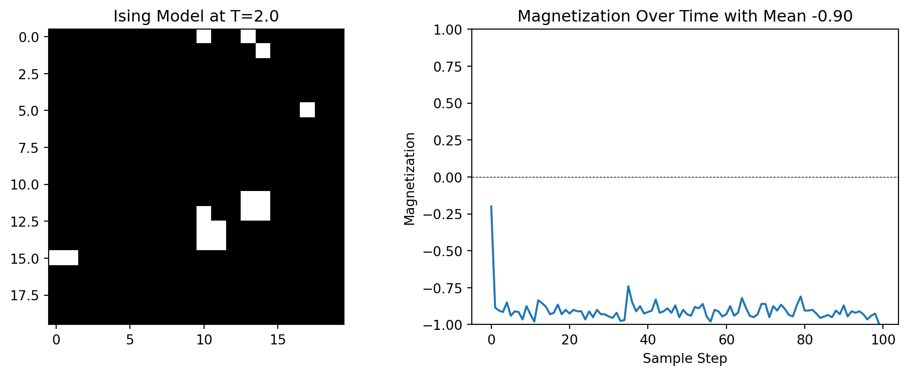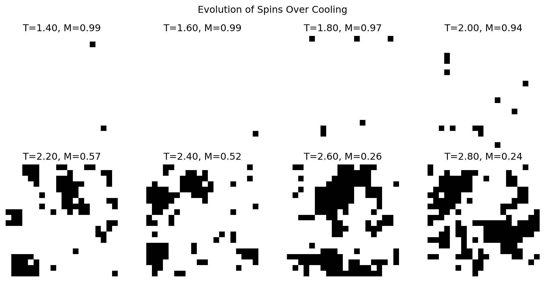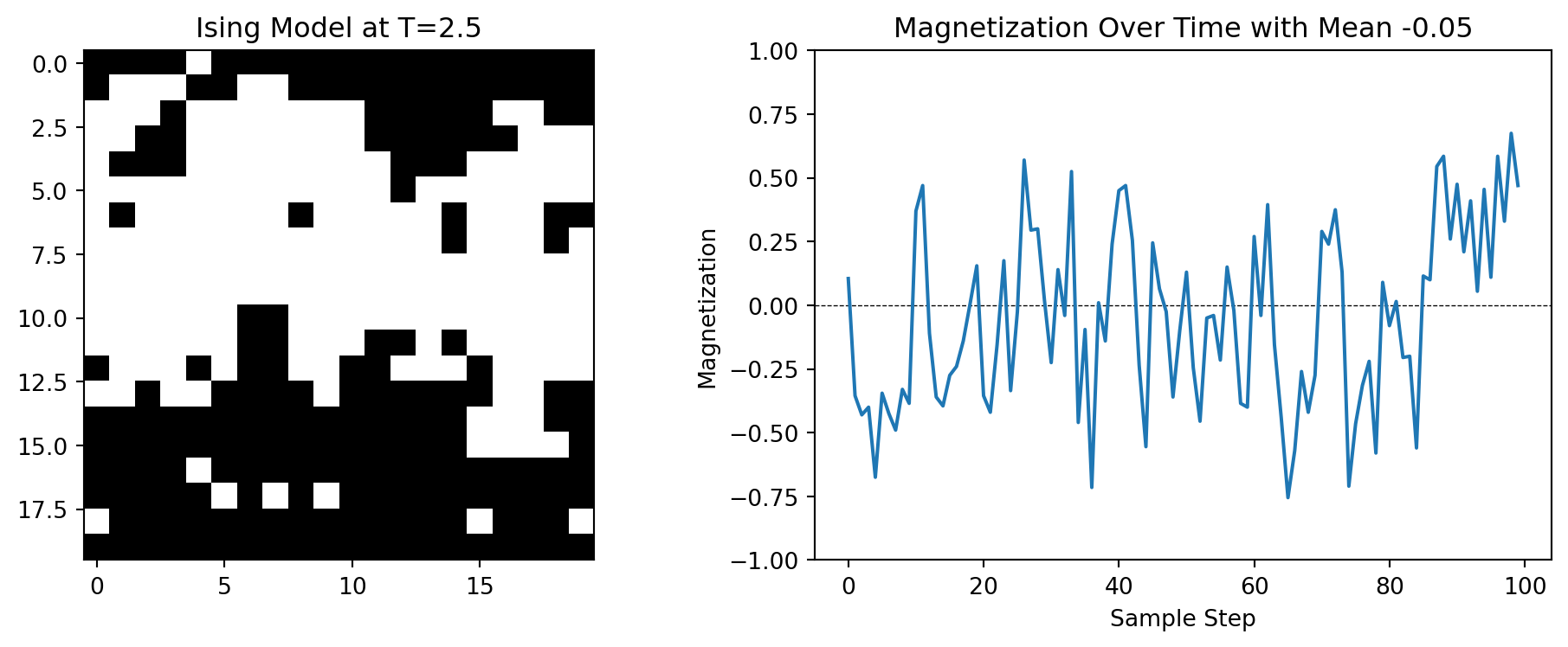 Below are the results of simulating the Ising model on a \(20 \times 20\) grid for \(J = 1\). The predicted critical temperature is \(T_c = 2.269\).