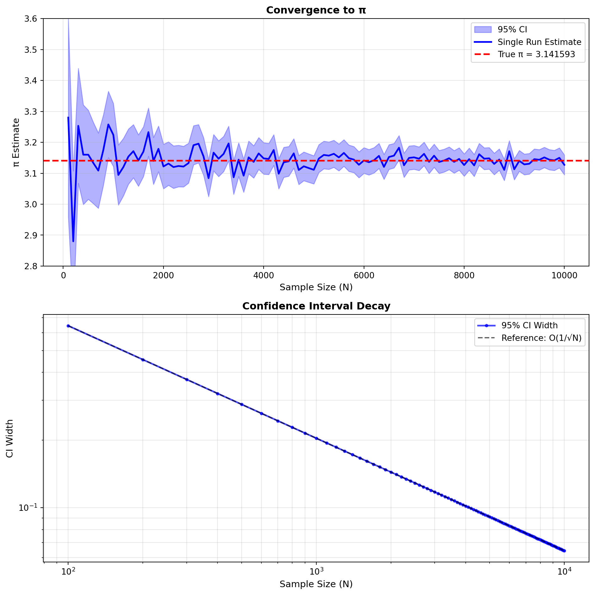 The figure demonstrates that as the sample size \(N\) increases, the mean estimate approaches the true value of \(\pi\) and the confidence interval narrows, confirming the \(O(1/\sqrt{N})\) convergence rate.