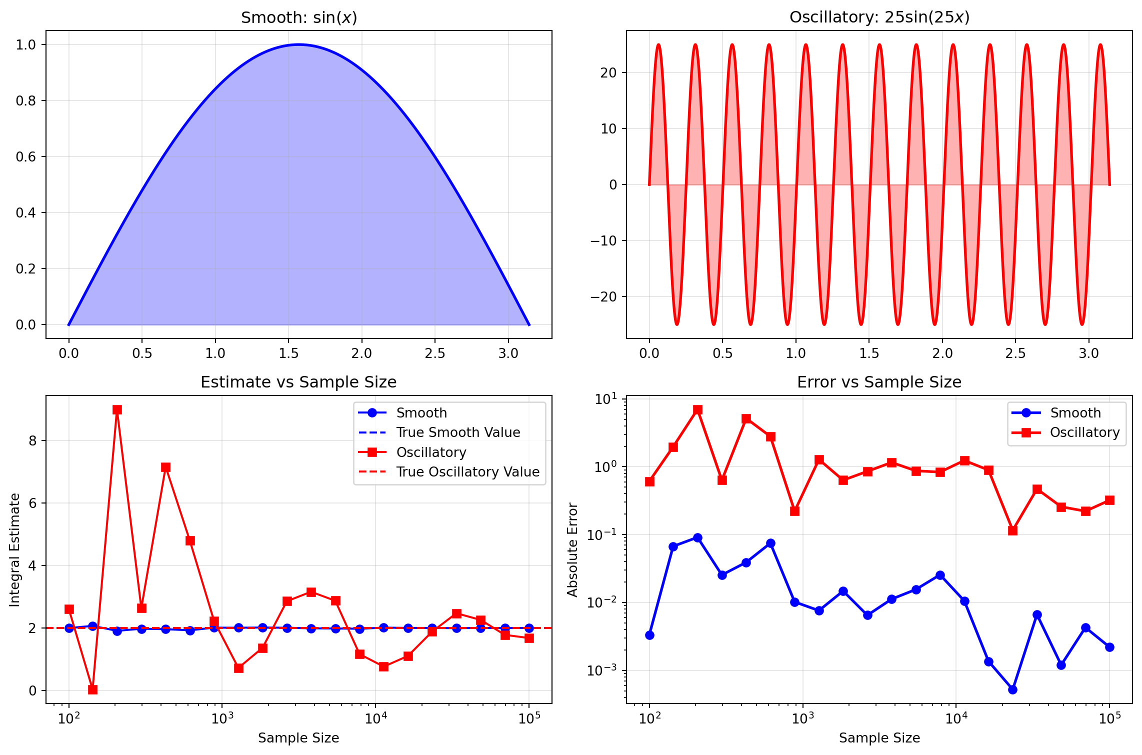 The contrast between the smooth \(\sin(x)\) and rapidly oscillating \(25\sin(25x)\) demonstrates why integration difficulty varies. The high-frequency function has many more sign changes and local extrema that random sampling must capture.