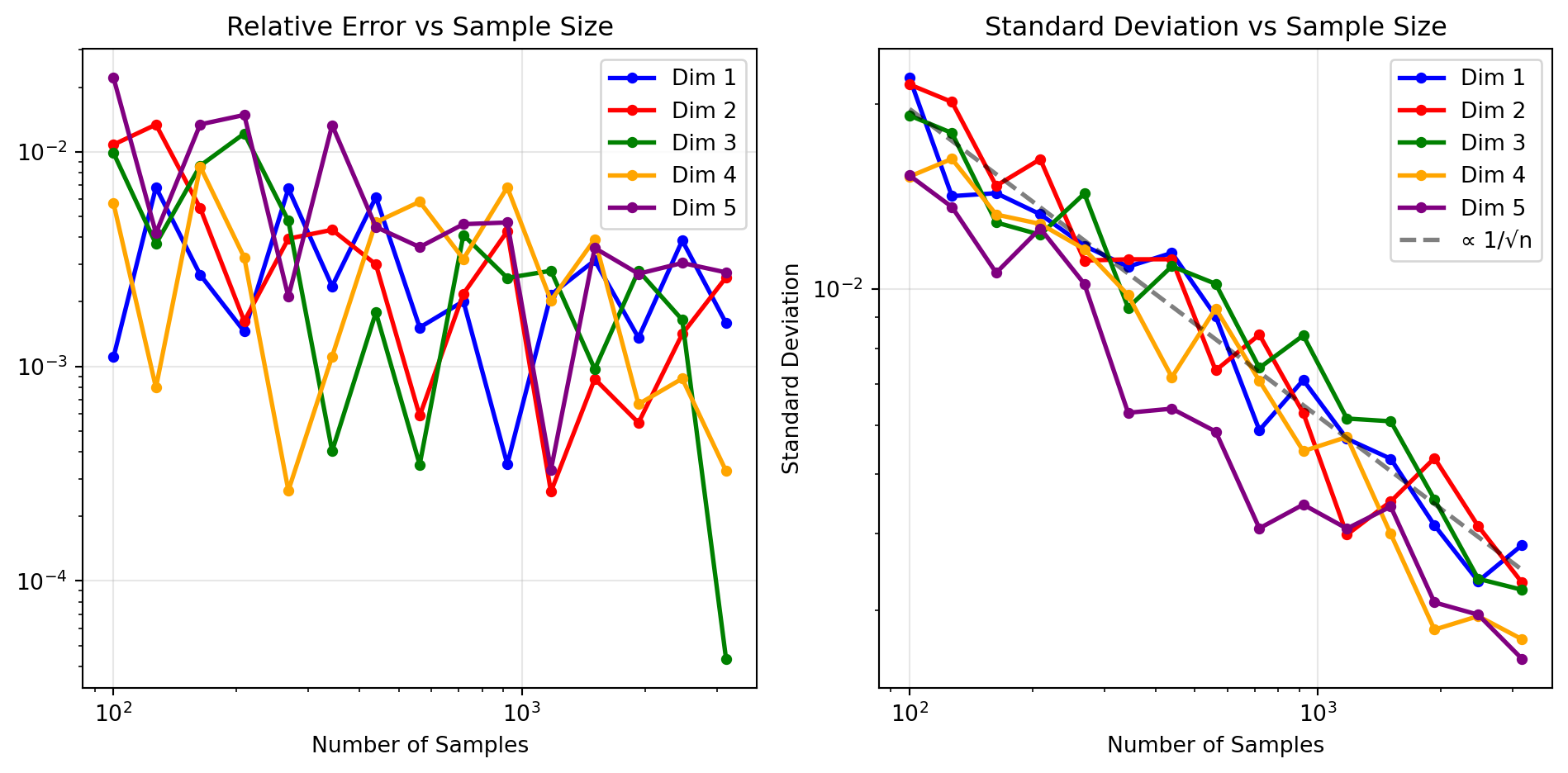 Theoretical Validation: The standard deviation follows the expected \(1/\sqrt{n}\) scaling (shown by the dashed reference line) regardless of dimension, confirming Monte Carlo’s theoretical foundation.